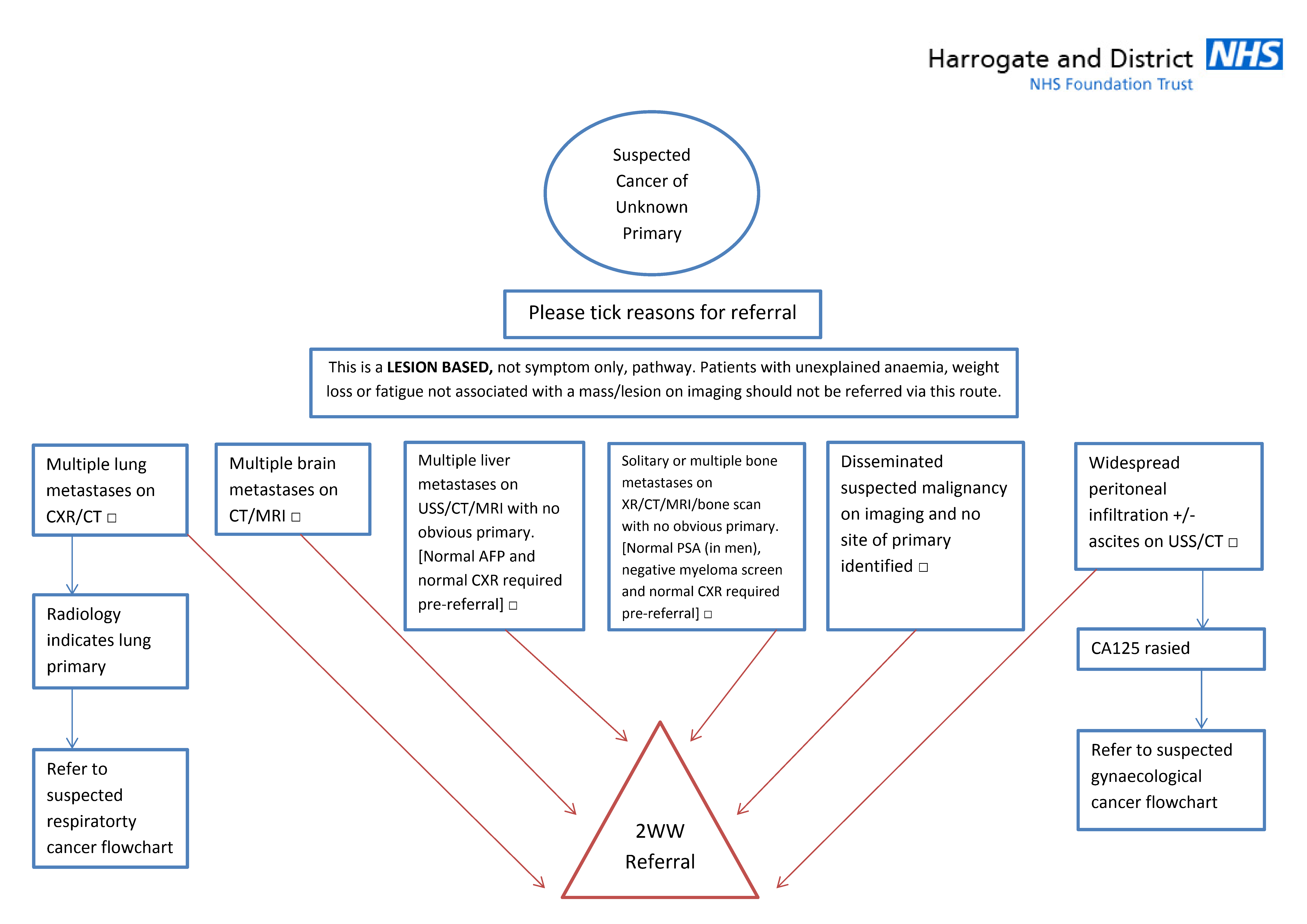 - Multiple liver metastases on USS/CT/MRI with no obvious primary. [Normal AFP and normal CXR required pre-referral]