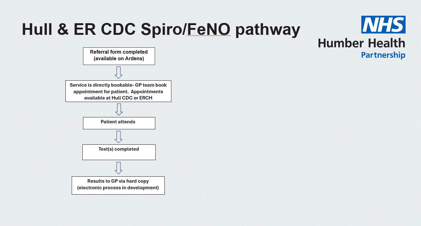 - Referral to be made using the spirometry +/- BDR and FeNO request via eRS