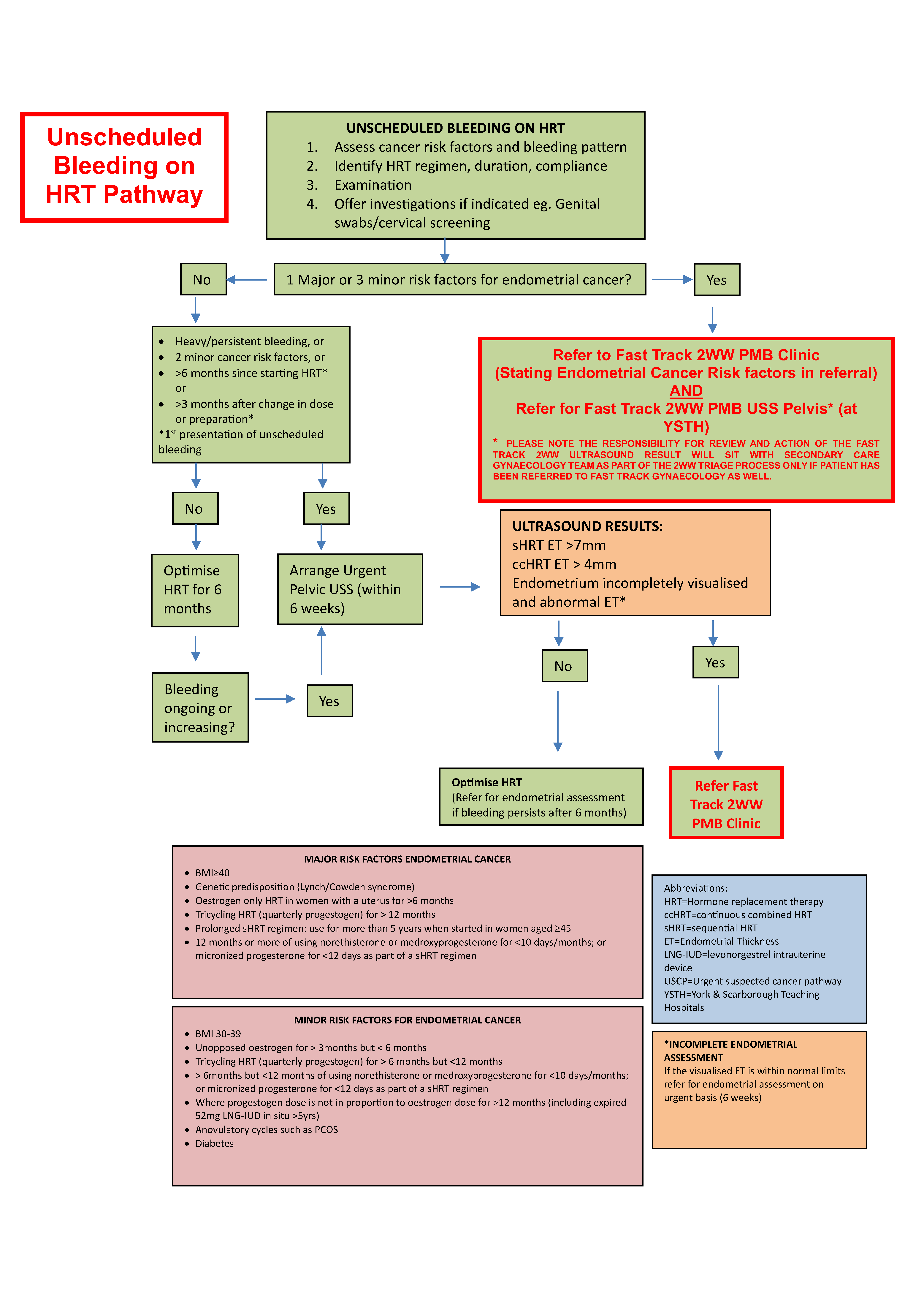 This pathway is for persons taking HRT experiencing unscheduled bleeding. It should be read alongside the BMS guidance for unscheduled bleeding on HRT.