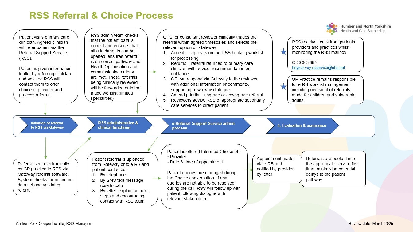 The Referral Support Service (RSS) is a local service working on behalf of NHS Humber and North Yorkshire ICB.The aim of the RSS is to get patients the right care, at the right time, in the right place, first time. |